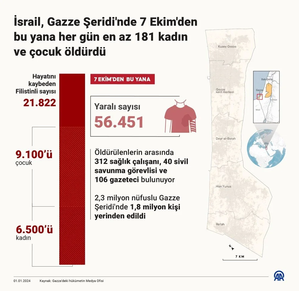 Gazze’de şu ana kadar yüzde 70’i kadın ve çocuk 7 bin kişinin halen enkaz altında veya kayıp olduğu belirtilirken, hastanelere ulaşan cenazelerin sayısının 22 bin 438 olduğu, 57 bin 614 kişinin de yaralandığı kaydedildi.