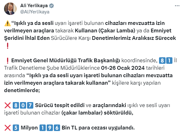 İçişleri Bakanı Ali Yerlikaya, “1-26 Ocak arasında 81 ilde gerçekleştirilen denetimlerde 807 sürücünün çakar lambası söktürüldü, toplam 5 milyon 196 bin TL ceza uygulandı” ifadesine yer verdi.