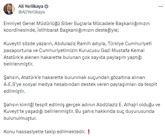 Sosyal medya hesabında art arda Atatürk’e yönelik kabul edilemez paylaşımlar yapan Kuveytli yazar tepki çekti. Yerlikaya’nın konuyla ilgili açıklamasının tamamı şu şekilde: “Emniyet Genel Müdürlüğü Siber Suçlarla Mücadele Başkanlığımızın koordinesinde, İstihbarat Başkanlığımızın desteğiyle; Kuveytli sözde yazarın, Abdulaziz Ramih adıyla, Türkiye Cumhuriyeti pasaportuna ve Cumhuriyetimizin Kurucusu Gazi Mustafa Kemal Atatürk’e alenen hakarette bulunan çok sayıda paylaşım yaptığı belirlenmiştir. Şahsın, Atatürk’e hakarette bulunmak suçundan gözaltına alınan A.E.S’ye sosyal medya hesabından destek veren paylaşımları da tespit edilmiştir. Şahsın kimliği tespit edilmiş gerçek adının Abdülaziz E. Alhajri olduğu ve Kuveyt’te yaşadığı belirlenmiştir. Bu şahıs hakkında suç duyurusunda bulunulmuştur. Konu hassasiyetle takip edilmektedir.”