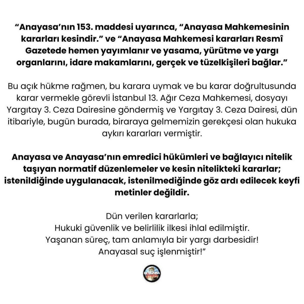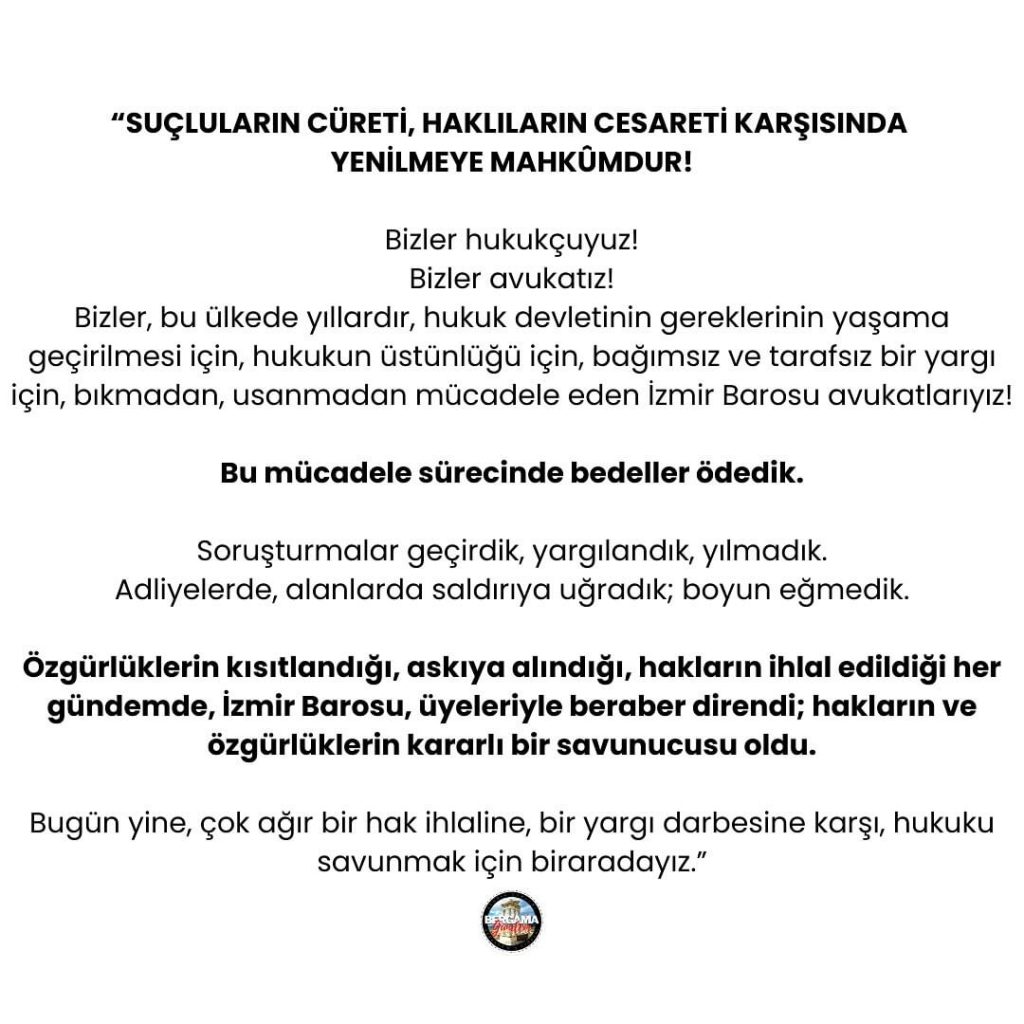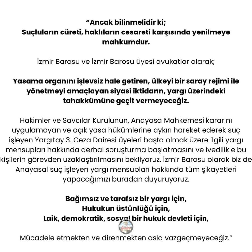 İzmir Barosu Bergama Temsilcisi Avukat Gürsel Öztaş ve Bergamalı Avukatlar, Yargıtay’ın Can Atalay için ihlal kararı veren AYM üyelerine suç duyurusunda bulunmasıyla ilgili basın açıklaması yaptı.