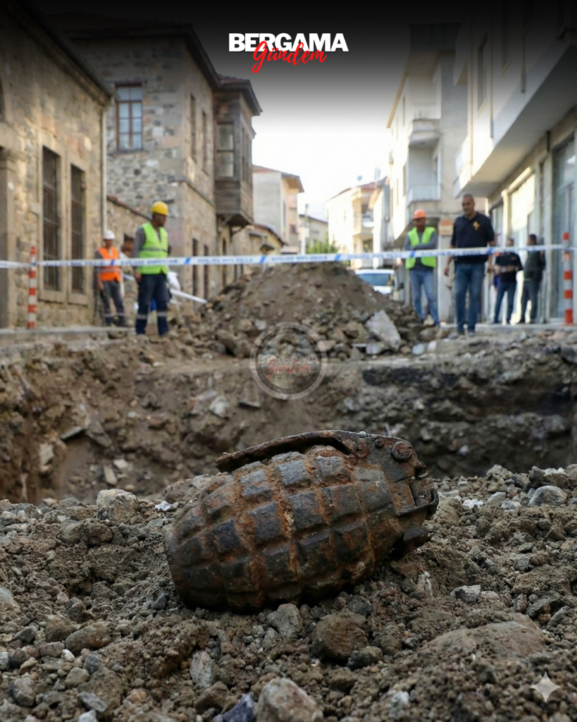 Bergama’da Park Otel Sokak’ta devam eden kazı çalışmaları sırasında yer altından patlamamış bir el bombası çıkarıldı.