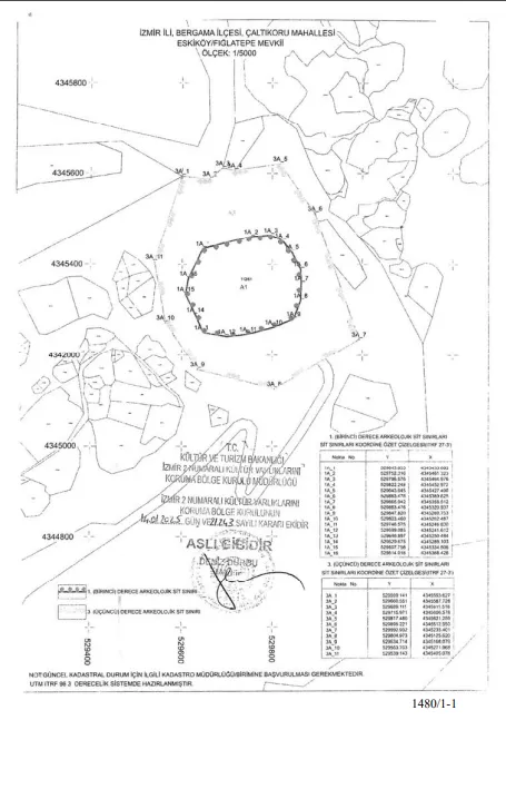 Kararda, “İzmir ili, Bergama ilçesi, Çaltıkoru Mahallesi’nde 112 ada 61 numaralı orman parselinde tespit edilen ve Eskiköy/Fığlatepe olarak adlandırılan arkeolojik alanın, karar eki 1/5000 ölçekli kadastral pafta üzerinde gösterildiği şekliyle 1. ve 3. derece arkeolojik sit alanı olarak tescil edilmesine ve ekli tescil fişinin uygun olduğuna karar verilmiştir.” ifadelerine yer verildi.