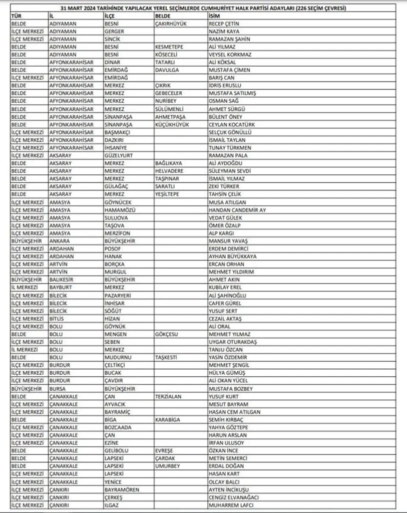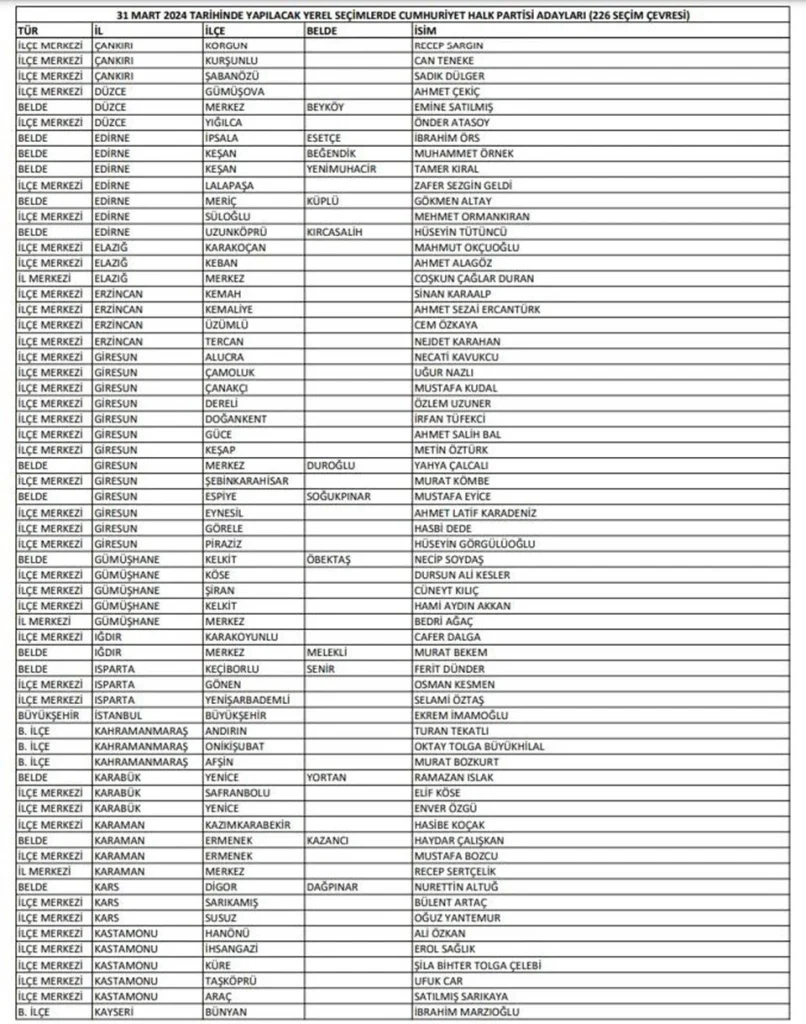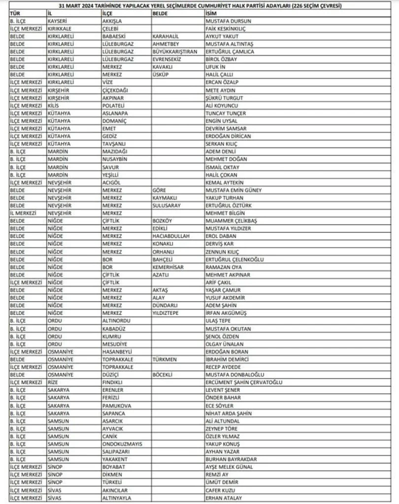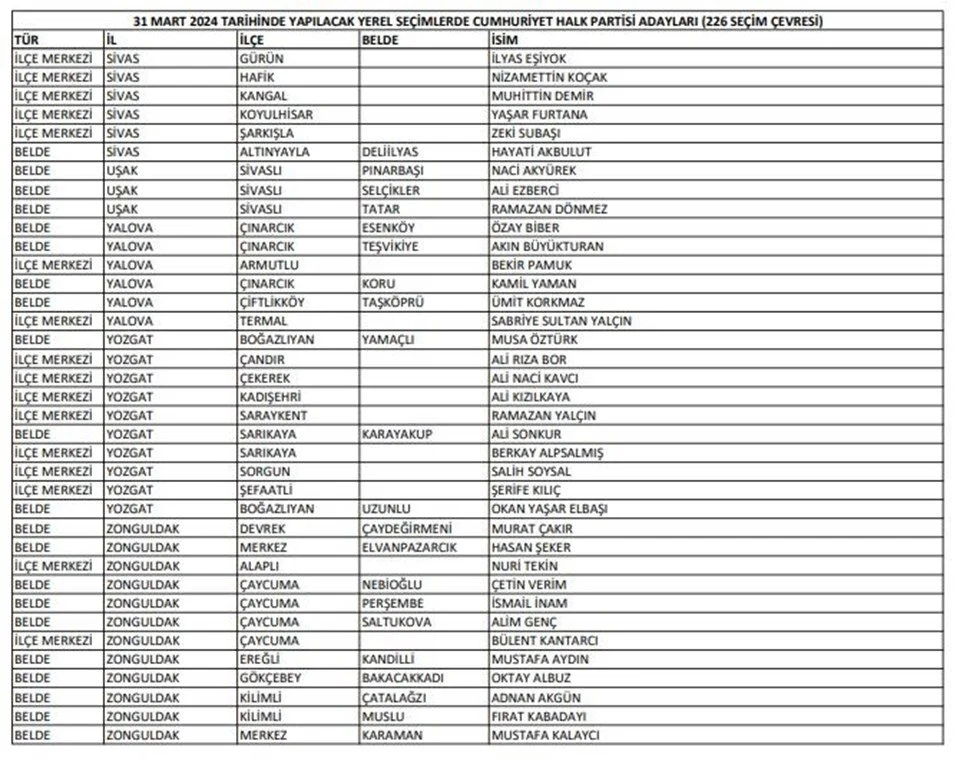 CHP’nin diğer il ve ilçe belediye başkan adayları ise şu şekilde: