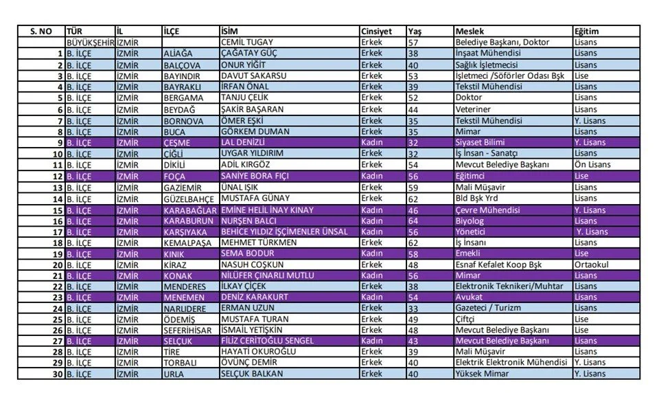 Bornova’da Ömer Ekşi, Bayraklı’da İrfan Önal, Buca’da Görkem Duman, Konak’Ta Nilüfer Çınarlı Mutlu, Urla’da Selçuk Balkan ve Foça’da Saniye Bora Fıçı diğer aday gösterilen isimler oldu. Aday gösterilen isimlerin 9’nun kadın 12’sinin ise 40 yaş altı isimlerden oluşması dikkat çekti.