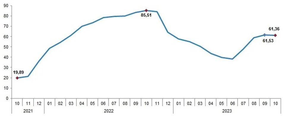 TÜİK verilerine göre, ekim ayında TÜFE yüzde 3,43 artış gösterdi. Yıllık bazda TÜFE yüzde 61,36 seviyesinde gerçekleşti.