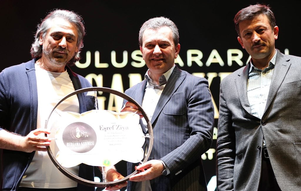 Konser sonunda Parşömen’den yapılan plaketi ve çiçeği sanatçı Eşref Ziya’ya AK Parti Genel Başkan Yardımcısı Hamza Dağ ile Belediye Başkanı Hakan Koştu birlikte verdiler. Ezgilerle Bergama’yı mest eden sanatçı Eşref Ziya’ya muhteşem konseri için teşekkür ettiler.