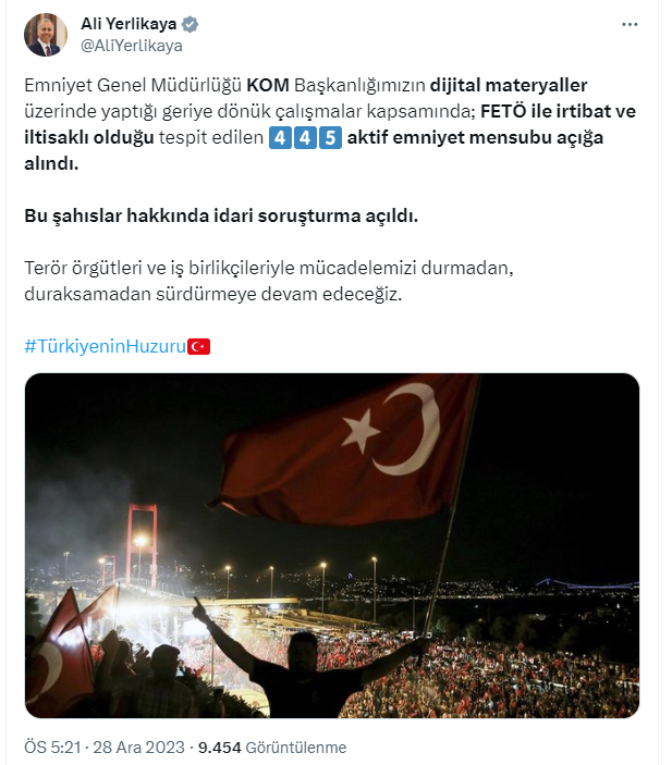 Gelişmeyi sosyal medya platformu X hesabı üzerinden duyuran İçişleri Bakanı Ali Yerlikaya, şunları söyledi: “Emniyet Genel Müdürlüğü KOM Başkanlığımızın dijital materyaller üzerinde yaptığı geriye dönük çalışmalar kapsamında; FETÖ ile irtibat ve iltisaklı olduğu tespit edilen 445 aktif emniyet mensubu açığa alındı.