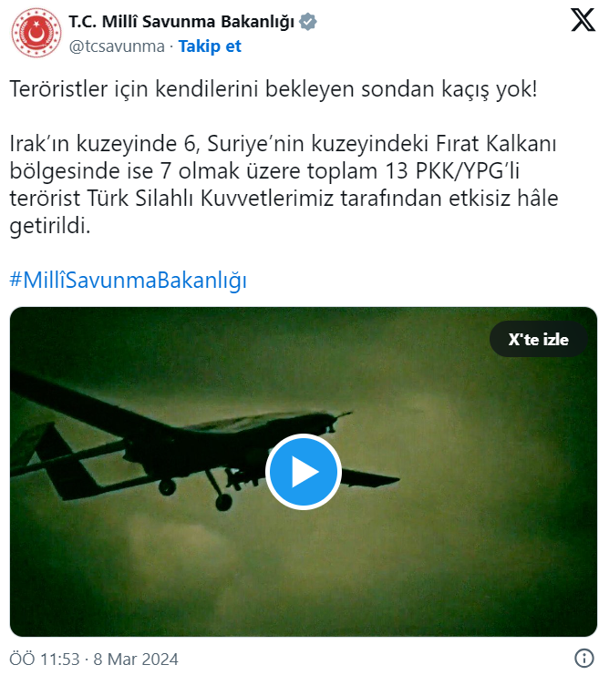 Irak’ın kuzeyinde 6, Suriye’nin kuzeyindeki Fırat Kalkanı bölgesinde ise 7 olmak üzere toplam 13 PKK/YPG’li teröristin Türk Silahlı Kuvvetlerimiz tarafından etkisiz hale getirildiği belirtildi.