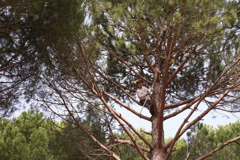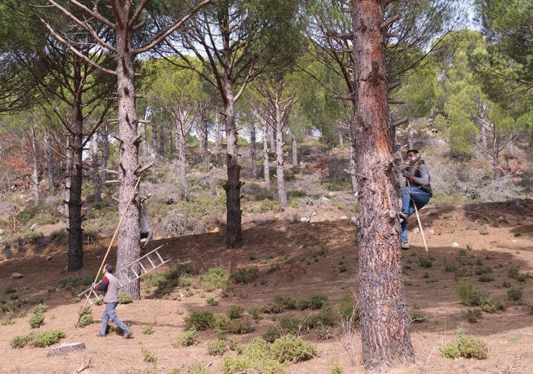 Metrelerce yükseklikteki fıstıkçamı ağaçlarına tırmanarak çam kozalağı hasadını yapan orman köylüsü Ali Demiroluk ise günlük 450 TL kazandığını ve aile bütçesine katkı sağladığını belirtti.