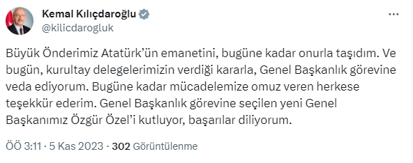 CHP’nin eski genel başkanı Kemal Kılıçdaroğlu, 38. Olağan Kurultayı sonrası, “Büyük Önderimiz Atatürk’ün emanetini, bugüne kadar onurla taşıdım. Ve bugün, kurultay delegelerimizin verdiği kararla, Genel Başkanlık görevine veda ediyorum. Bugüne kadar mücadelemize omuz veren herkese teşekkür ederim. Genel Başkanlık görevine seçilen yeni Genel Başkanımız Özgür Özel‘i kutluyor, başarılar diliyorum” paylaşımında bulundu.