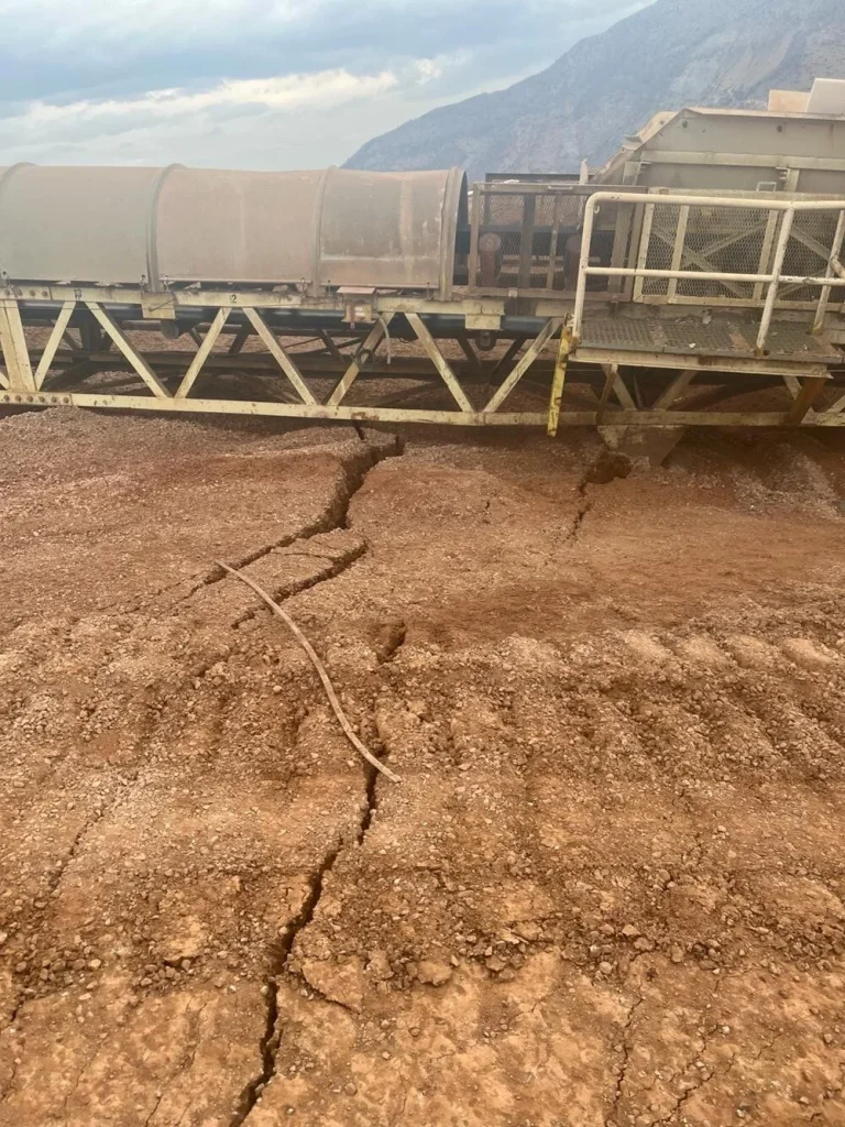 Fotoğraflarda, yığın liç alanında biriktirilen topraklarda derin yarıkların oluştuğu görülüyor.