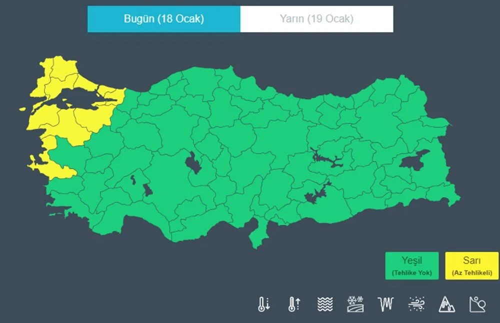 Meteoroloji Genel Müdürlüğü tarafından yapılan son değerlendirmelere göre: Ülkemiz genelinin parçalı ve çok bulutlu, (Sakarya ve Bilecik hariç) Marmara, Kıyı Ege, Batı Akdeniz kıyıları, Doğu Akdeniz ile Adıyaman ve Bolu ile Ankara’nın kuzey, Çankırı’nın batı çevrelerinin yağmur ve sağanak yağışlı geçeceği tahmin ediliyor. Kuzey, İç ve doğu kesimlerde sabah ve gece saatlerinde pus ve yer yer sis görülmesi bekleniyor. Doğu Karadeniz’in iç kesimleri ile Doğu Anadolu’nun kuzey ve doğusunda çığ tehlikesi bulunmaktadır.
