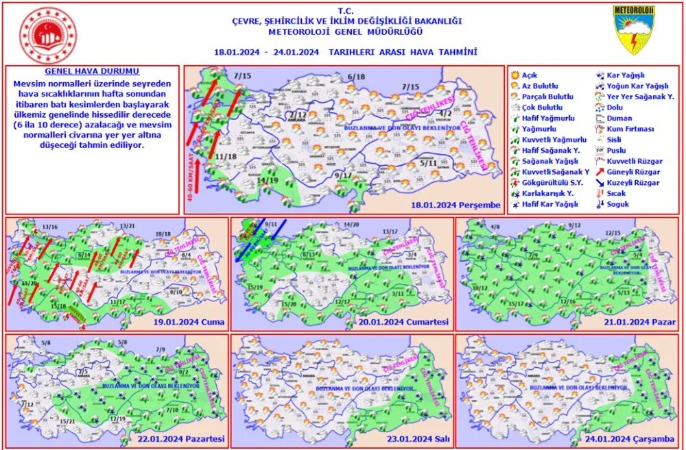 MGM’nin 7 günlük hava tahmin raporuna göre hafta sonundan itibaren batı kesimlerden başlayarak yurt genelinde sıcaklıkların 6 ila 10 derece azalacağı ve mevsim normalleri altına düşeceği belirtildi.