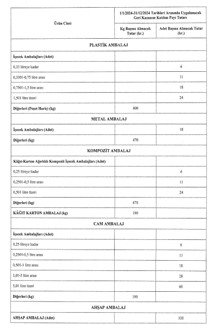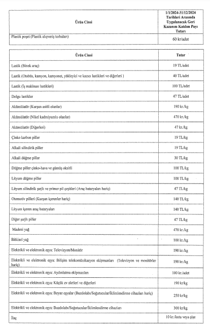 İşte ürün ürün geri kazanım katılım payları: