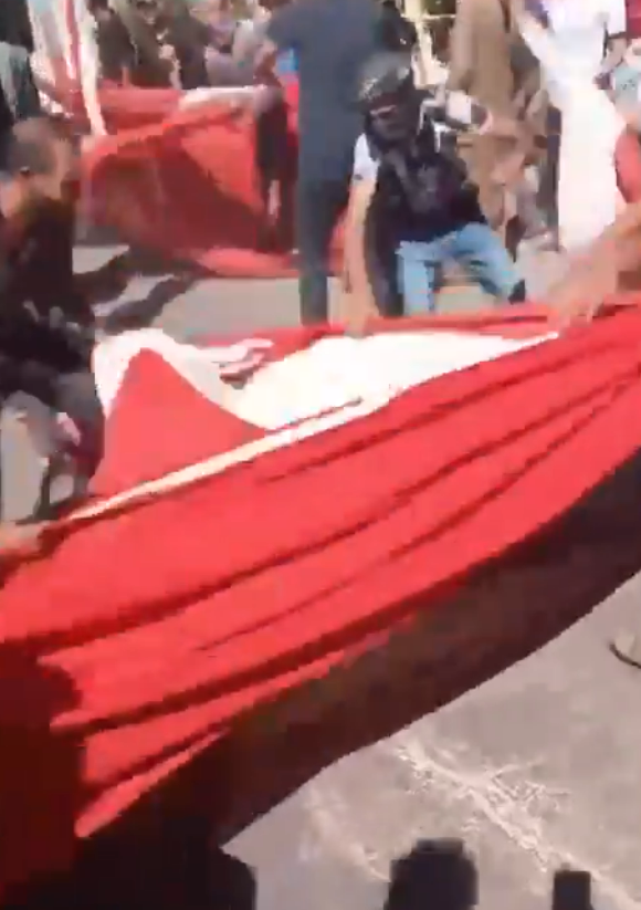 Sosyal medyada yayılan bir başka görüntüde, Türkiye-Suriye sınırının sıfır noktasında toplanan bir grup, buldukları Türk bayrağını parçaladı. Grubun küstah hareketleri anbean kaydedildi.