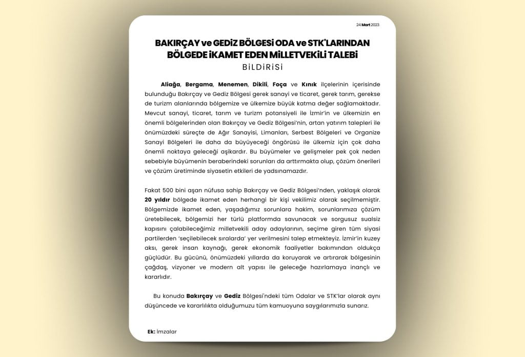 Bergama, Aliağa, Menemen Ticaret Odaları ve Esnaf Odası Başkanları, bölgeden Milletvekili çıkması için Bergama Ticaret Odası ev sahipliğinde düzenlenen toplantıda “Milletvekili Talebi Bildirisi” imzaladı.