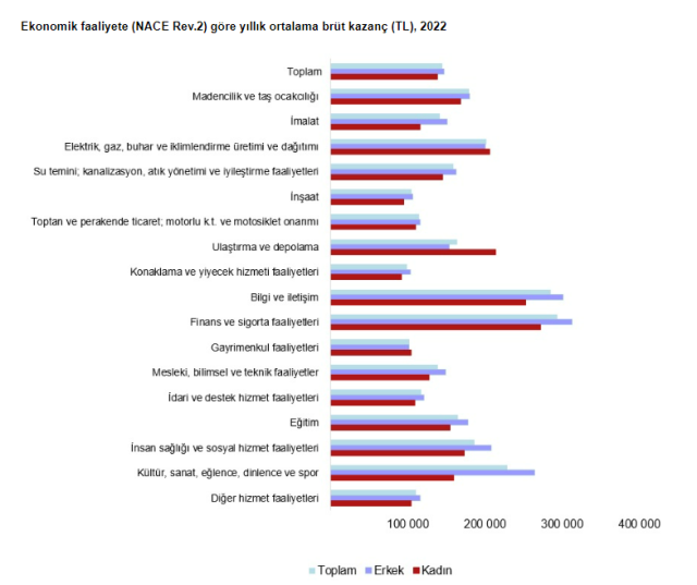 Ekonomik faaliyet sınıflamasına göre kadın çalışanların yıllık ortalama brüt kazancı ulaştırma ve depolama faaliyetinde 213 bin 810 TL, elektrik, gaz, buhar ve iklimlendirme üretimi ve dağıtımı faaliyetinde 206 bin 633 TL ve gayrimenkul faaliyetlerinde 104 bin 387 TL ile bu sektörlerdeki erkek çalışanların yıllık ortalama brüt kazancının üzerinde gerçekleşti.