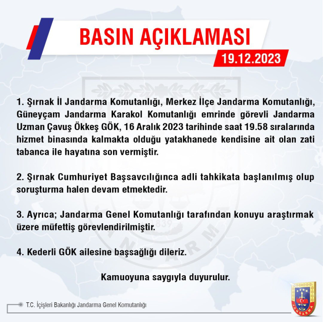 1. Şırnak İl Jandarma Komutanlığı, Merkez ilçe Jandarma Komutanlığı, Güneyçam Jandarma Karakol Komutanlığı emrinde görevli Jandarma Uzman Çavuş Ökkeş GÖK, 16 Aralık 2023 tarihinde saat 19.58 sıralarında hizmet binasında kalmakta olduğu yatakhanede kendisine ait olan zati tabanca ile hayatına son vermiştir.