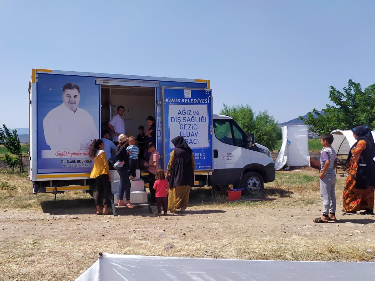 Sağlık Bakanlığı ve Kınık Belediyesi işbirliğiyle Sıhhat Projesi kapsamında Kınık Belediyesi tarafından hayata geçirilen “Ağız ve Diş Sağlığı Gezici Teşhis ve Tedavi aracı” sağlık taraması, ağız ve diş tedavileri sağlık hizmetini mevsimlik tarım işçilerinin ayağına götürüyor.