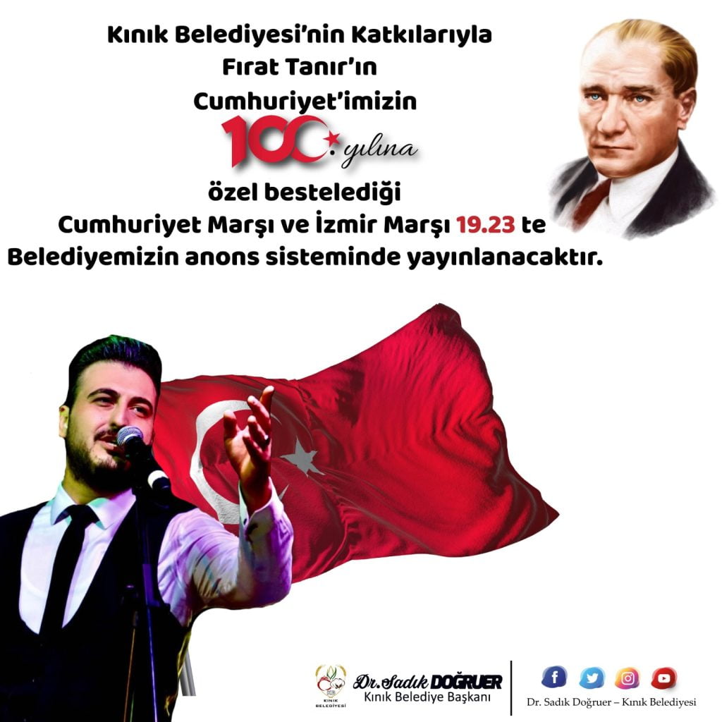 Kınık’ın yerel sanatçısı olan Fırat Tanır’ın yazıp Kınık Belediye Korosu ve Kınıklılarla seslendirdiği 100. yıl Marşı Cumhuriyetin 100. yılına damga vurdu. Kınık Belediye Başkanı Dr. Sadık Doğruer’in destekleriyle de YouTube üzerinden paylaşımı yapılan 100. yıl Marşı’nın klibi, 29 Ekim günü izleyicilerin beğenisine sunuldu.