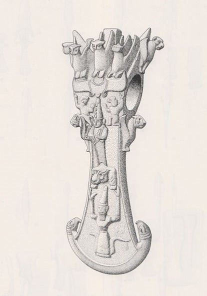 “Şarkışla’dan geldiği bilinen bronzlar (tarihi eserler) arasında eşsiz bir parça, kültsel öneme sahip figürler taşıyor ve her iki düz tarafında da yoğun kabartmalı aynı sahneler bulunuyor. Balta tek bir parça olarak dökülmüş. Bunu süsleyen bireysel figürler, çoğunlukla Hitit İmparatorluk döneminin tanıdık eserlerine benziyor. Külahlı bir dağ adamı bir aslanın üzerinde duran tanrıyı taşıyor. Onun üstünde diz çökmüş grifon adamlar (kanatları kartal, vücutları aslan olan mitolojik yaratık) güneş kursuna ve kanatlı aslanlara ve grifonlara destek veriyor. Başka envanter metinlerinde Hitit kültünde var olan böyle süslü balta şeklindeki rhyton/içki kaplarından bahsediliyor ancak günümüze ulaşan tek “Tören Baltası” bu.”